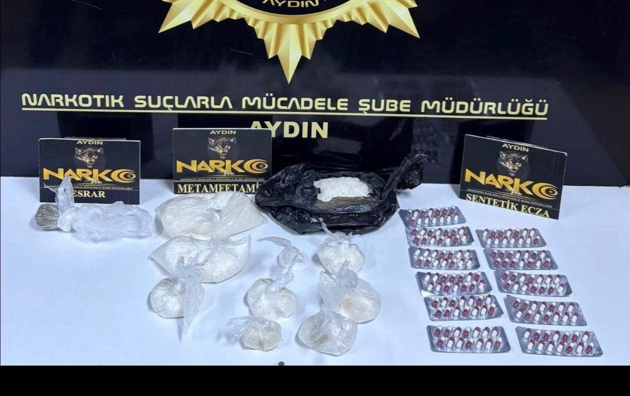 Aydın İl Emniyet Müdürlüğü Narkotik Suçlarla Mücadele Şube Müdürlüğü ekipleri, uyuşturucu madde ticaretinin önlenmesine yönelik çalışmalarda Osman Yozgatlı Mahallesi’nde şüpheli S. T.’nin üzerinde ve ikametinde yapılan aramada; 10 parça halinde toplam 1 kilo 800 gram metamfetamin, 1 parça halinde 10 gram esrar, 154 Lyrica sentetik ecza hap ve 1 hassas terazi ele geçirildi.