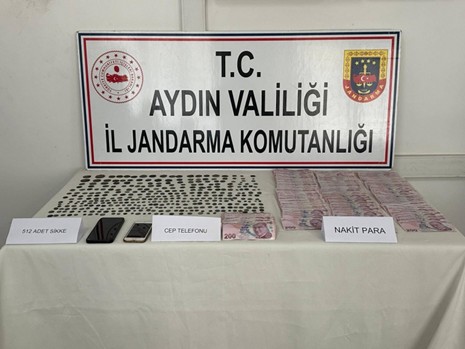 Aydın İl Jandarma Komutanlığına bağlı ekipler Karacaören Mahallesi yakınlarında sabah saatlerinde şüphe üzerine bir otomobili durdurularak arama yaptı. Otomobilde yapılan aramalarda: 512 tarihi sikke, 60 bin 385 TL suçtan elde edildiği değerlendirilen para, 43 adet tarihi obje ve 22 gram reçine esrar ele geçirildi. Gözaltına alınan M.G.’nin Denizli’de ki evine ise Denizli İl jandarma Komutanlığı ekipleri tarafından arama yapıldığı öğrenildi. Şüphelinin jandarmadaki işlemlerinin sürdüğü öğrenildi.