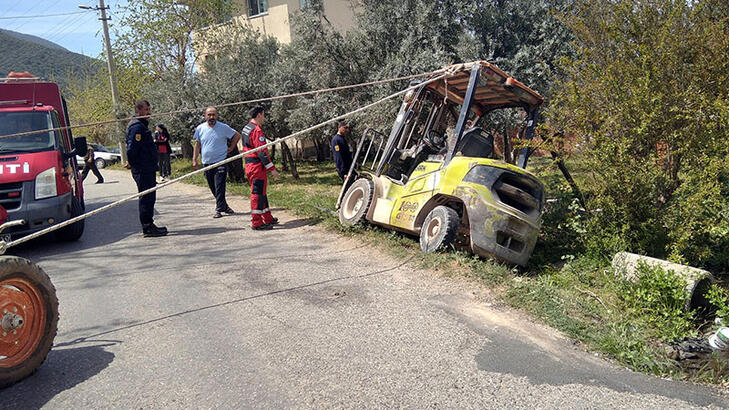 Olay bugün saat 13.00 sıralarında Fethiye‘nin Karaçulha Mahallesinde meydana geldi. Mehmet Göven yönetimindeki forklift, yol kenarındaki zeytinliğe devrildi. Çevredekilerin 112 Acil Çağrı Merkezi’ne ihbarı üzerine olay yerine itfaiye, sağlık ve polis ekipleri sevk edildi. İtfaiye görevlileri ve vatandaşlar tarafından kaldırılan 4,5 ton ağırlığındaki forkliftin altında kalan genç operatörün olay yerinde yaşamını yitirdiği belirlendi.
