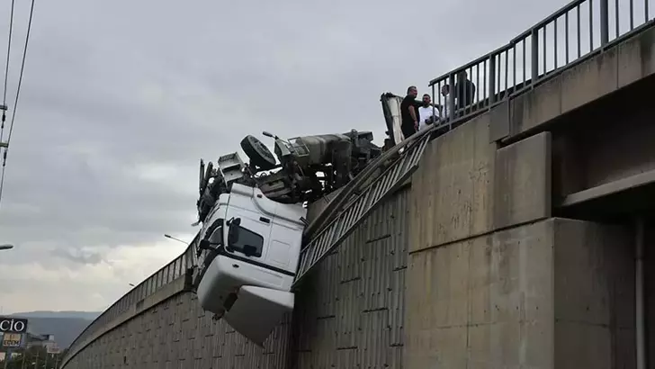 İzmir’in Bornova ilçesinde yağmur nedeniyle kayganlaşan yolda devrilen TIR’ın kupası viyadükte asılı kalırken, şoförü İrfan Öngen (48) yaralandı.