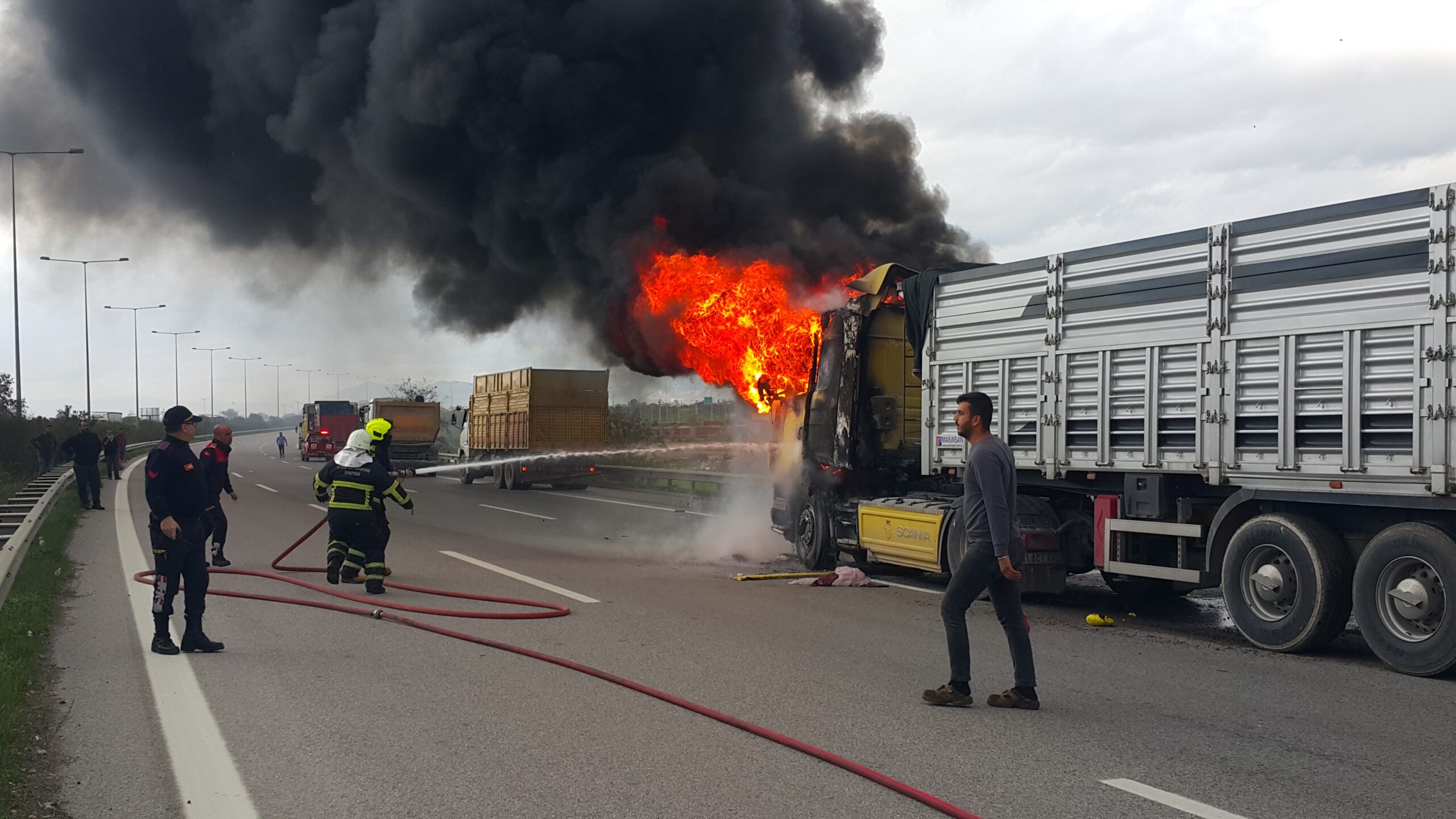 Çarpmanın şiddetiyle TIR’ın ön kısmı alev topuna dönerken, sürücü Halil Akıllıoğlu son anda kendini dışarı atarak yanmaktan kurtuldu. Yoldan geçen sürücüler yangın tüpleriyle yangına müdahale etmeye çalıştı. Çevredekilerin ihbarı üzerine olay yerine itfaiye, polis ve sağlık ekibi sevk edildi.