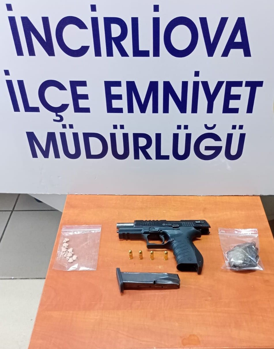 Aydın İncirliova İlçesinde Ahmet Yaşar Kocabıyık Stadı’nda oynanan Bölgesel Amatör Lig maçında stat girişinde polisin dikkati üzerine durdurup üzerine arama yapılan şüphelinin üzerinde uyuşturucu ve tabanca çıktı.