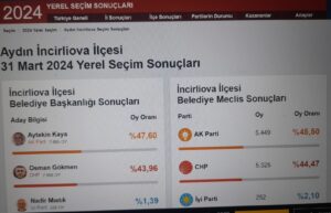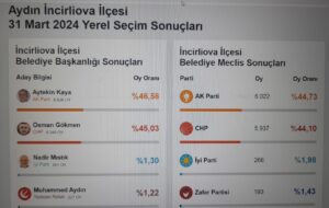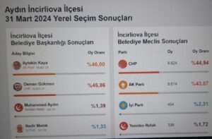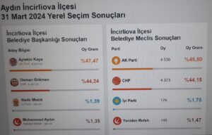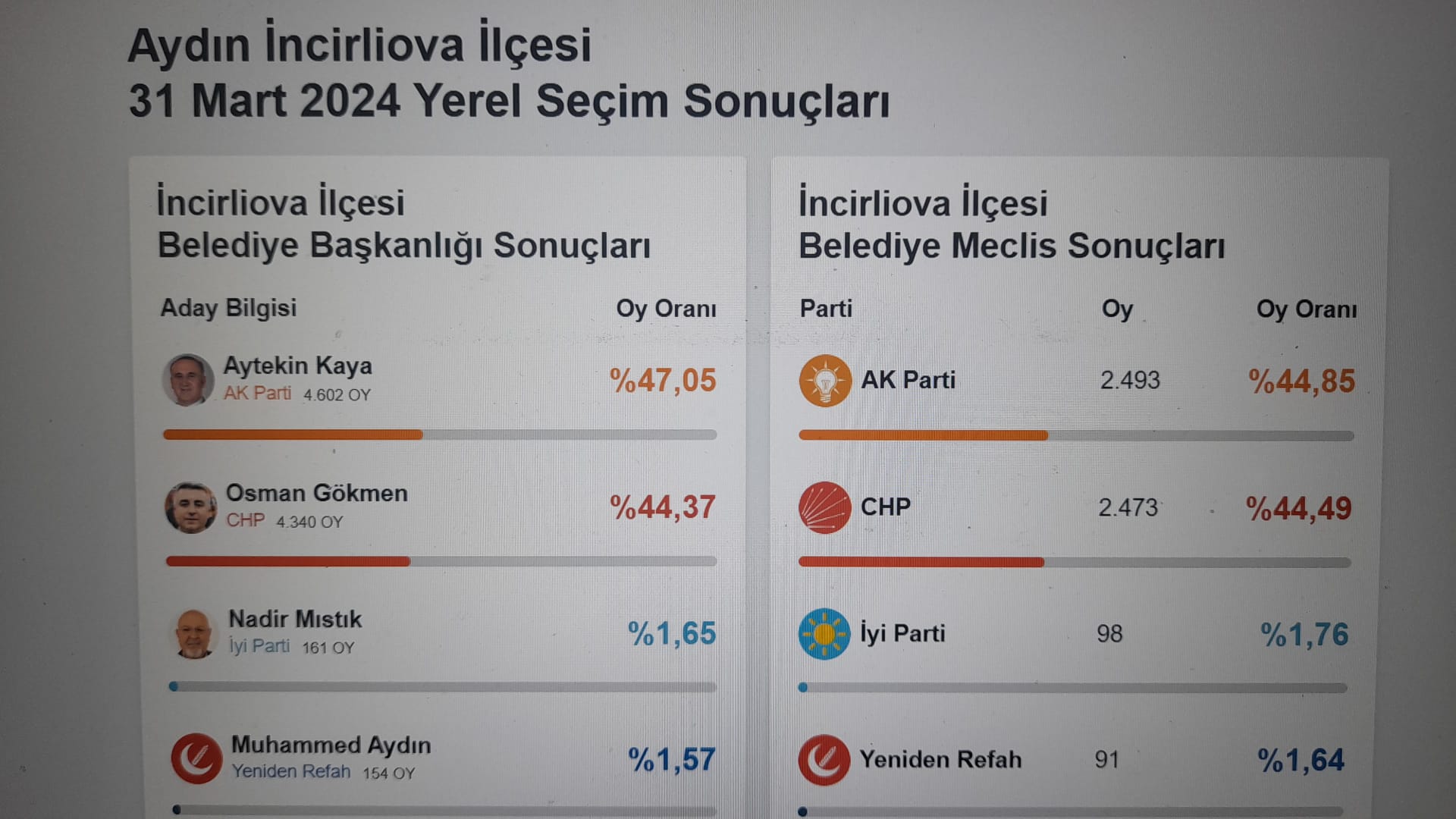 Cumhur İttifakı İncirliova Belediye Başkanı Aytekin Kaya ile CHP İncirliova Belediye Başkan Adayı Osman Gökmen arasında kıyasıya yarış devam ediyor. Açılan sandıklarda bir Osman Gökmen, bir Aytekin Kaya öne geçiyor. Aytekin Kaya çok az farkla şu anda yarışı önde götürüyor.