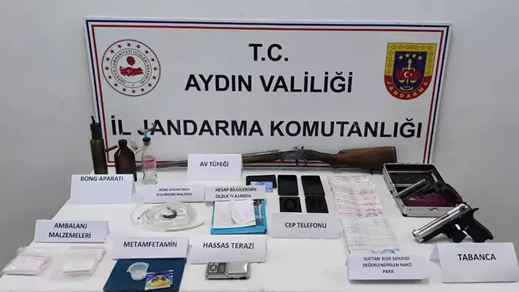 Aydın İl Jandarma Komutanlığı ve Kuşadası İlçe Jandarma Komutanlığı’na bağlı ekipler, uyuşturucu sattığı belirlenen suç örgütüne yönelik operasyon düzenlendi. Kuşadası’ndaki 3 ayrı adrese yapılan baskınlarda suç örgütü lideri E.P.’nin de aralarında bulunduğu 4 şüpheli, gözaltına alındı. Şüphelilerin ev ve iş yerlerindeki aramalarda 88 gram metamfetamin, ruhsatsız 9 mm çapında 1 tabanca, mekanizması olmayan 1 tabanca, 1 hassas terazi, bir miktar nakit para, 3 uyuşturucu içmekte kullanılan aparat, suçta kullanıldığı değerlendirilen 4 cep telefonu, muhtelif miktarda ambalaj poşeti ve 1 ajanda ele geçirildi. Jandarmadaki işlemlerinin ardından adliye sevk edilen E.P., Ö.K. ve Y.A. tutuklandı, diğer şüpheli adli kontrol şartıyla serbest bırakıldı.