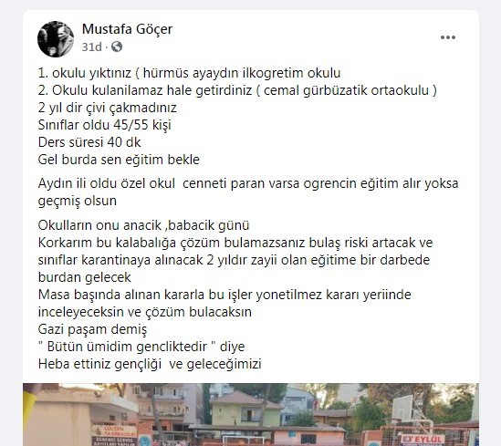 İncirliova’da depreme dayanıksız olduğu gerekçesiyle birçok okul yıkılınca o okullardaki öğrencilerde yakındaki okullarda eğitim görmeye başladı. Veliler bir yandan sınıflarda artan öğrenci sayısına tepki gösterirken, diğer yandan ise okul bahçesine alınmadıkları için daracık sokakta iç içe adeta koronavrüse davetiye çıkarak beklemek zorunda kalıyor. Velilerden Mustafa Göçer tepkisini sosyal medya hesabından da paylaşımda bulunarak, “Okulu yıktınız ( Hürmüz Ayaydın ilkokulu, kullanmamaz hale getirdiniz ( Cemal Gürbüzatik Ortaokulu) 2 yıldır çivi çakmadınız. Sınıflar oldu 45/55 kişi, ders süresi 40 dakika ve gel burada sen eğitim bekle. Aydın ili oldu özel okul cenneti paran varsa iğrencin eğitim alır yoksa geçmiş olsun. Okulların önü anacık, babacık günü korkarım bu kalabalığa çözüm bulamazsanız bulaş riski artacak ve sınıflar karantinaya alınacak. 2 yıldır zayii olan eğitime bir darbede buradan gelecek. Masa başında alınan kararla bu işler yönetilmez kararı yerinde inceleyeceksin ve çözüm bulacaksın. Gazi paşam demiş ‘Bütün ümidim gençliktedir’ diye heba ettiniz gençliği ve geleceğimizi” ifadelerini kullandı.