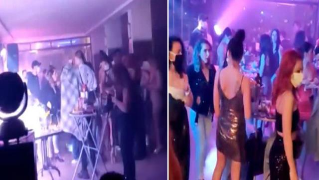 Aydın’ın Kuşadası ilçesinde, bir otelin lobisinde loş ışık ve müzik eşliğinde alkol alıp, koronavirüs kurallarını hiçe sayan kalabalık grubun eğlencesi polis baskınıyla sona erdi. O anlar ise cep telefonu ile görüntülendi. Polis ekiplerini karşılarında görenlerin maskelerini takmaya çalışmaları yer aldı.