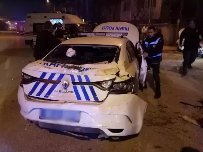 Bursa'nın İnegöl ilçesinde, polis otosu, otomobil ile elektrikli bisikletin karıştığı zincirleme kazada 2'si polis 4 kişi yaralandı.