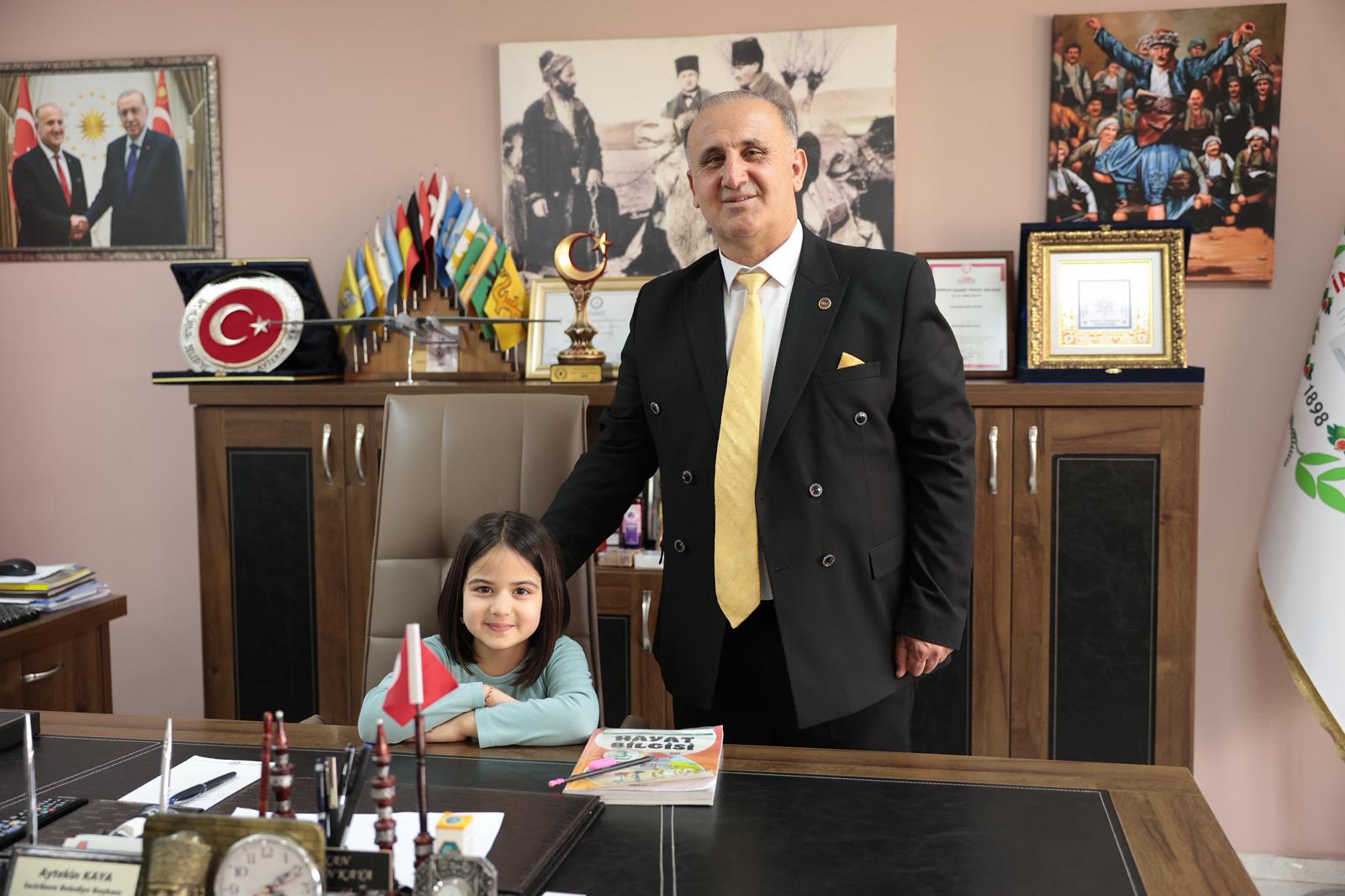İzzet Ayaydın İlkokulu 3/D sınıfı öğrencisi 8 yaşındaki Sare Değirmen, ödevi kapsamında Belediye Başkanı ile söyleşi yapması gerektiğini iletti. Küçük öğrencinin bu talebini geri çevirmeyen Başkan Kaya, Sare’yi makamında ağırladı. Samimi ve sıcak bir ortamda gerçekleşen buluşmada, Sare’nin sorularını içtenlikle yanıtlayan Başkan Kaya, ödevin tamamlanmasına katkı sağladı. Ziyaretin sonunda Sare’yi makam koltuğuna oturtan Başkan Kaya, bu anlamlı anı, hatıra fotoğrafı ile ölümsüzleştirdi.