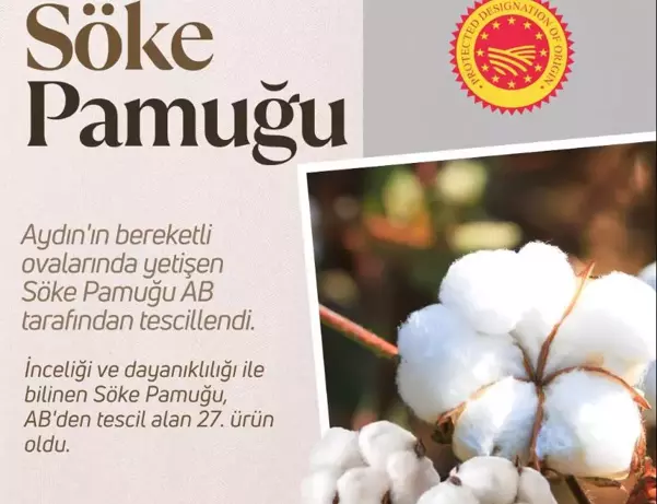 Tarım ve Orman Bakanı İbrahim Yumaklı, Aydın Söke pamuğunun Avrupa Birliği (AB) coğrafi işaret tescili aldığını açıkladı.