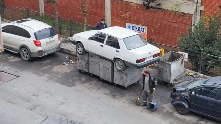 Ancak otomobili bırakan sürücü ayrılarak uzaklaştı. Duruma öfkelenen esnaf 2 gündür alınmayan otomobili, forklift kaldırarak çöp konteynerlerinin üzerine bıraktı.